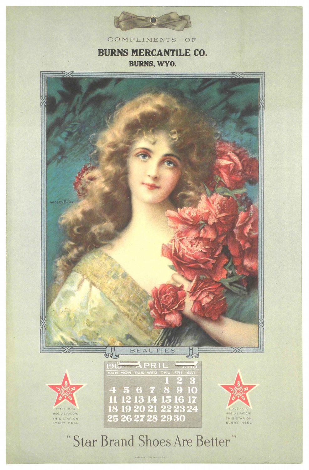 1915 Calendar for Star Brand Shoes. Compliments of Burns Mercantile Co, Burns, WY. April-Dec pages. Near mint condition. 8 1/2 X 13 inches.