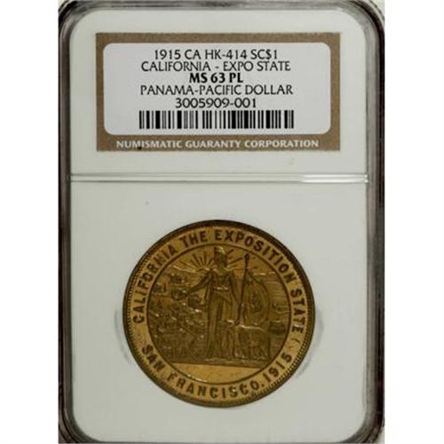 <B>1915 California, HK-414, MS63 Prooflike NGC.</B></I> Gilt brass, 34.9 mm. The obverse of this issue represents the State of California, while the reverse commemorates the completion of the Panama Canal. Beautiful prooflike surfaces with a negligible amount of abrasions, making this piece solid for the assigned grade. As of (8/07), NGC has certified 11 HK-414 so-called dollars in MS63, although only three have received the Prooflike designation. <BR><BR><b>Shipping:</b> Coins & Currency (<a target="_blank" href="http://www.heritageauctions.com/common/shipping.php">view shipping information</a>)