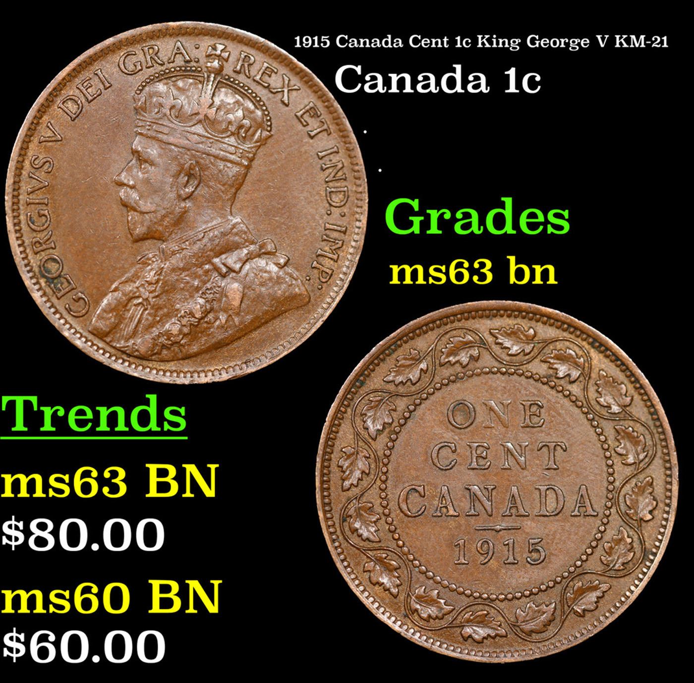 1915 Canada Cent 1c King George V KM-21 Grades Select Unc BN.