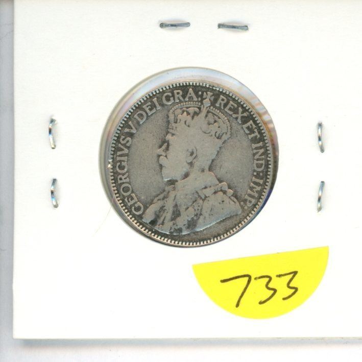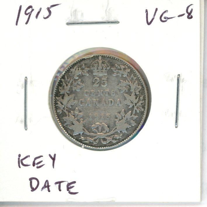 1915 Canadian Silver 25 Cents. Key Date. Mintage of 242,382. VG-8.