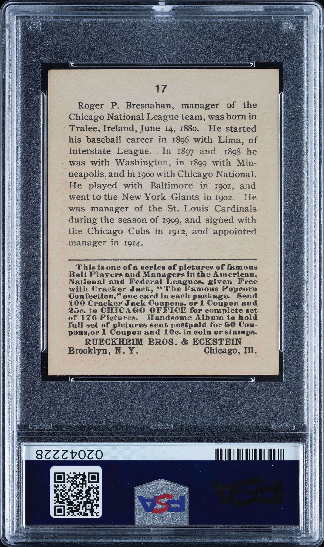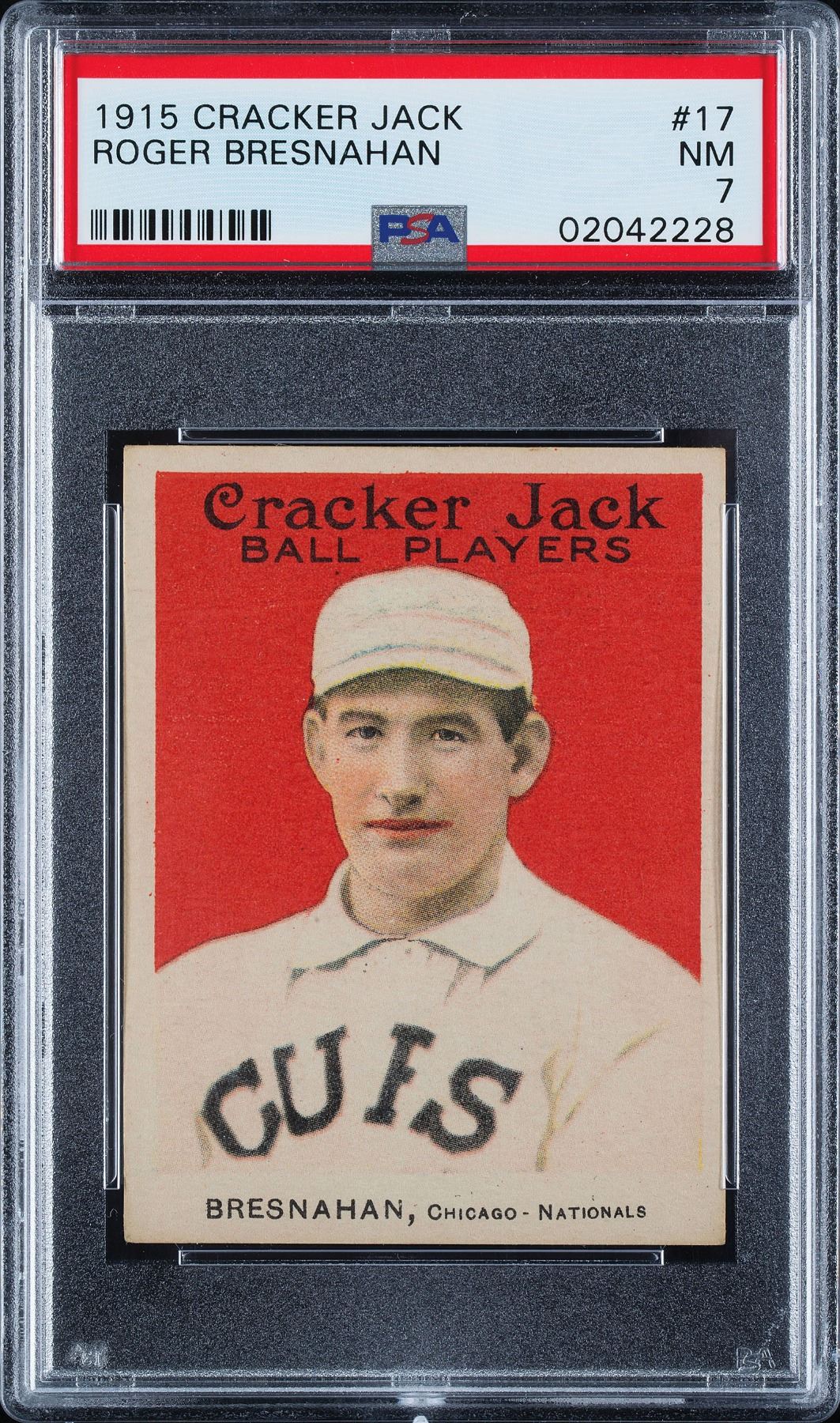 Graded by PSA NM 7. Very solid NM card of Hall of Famer Roger Bresnahan, who moved over from the Giants to the rival Cubs. Very nice overall quality.