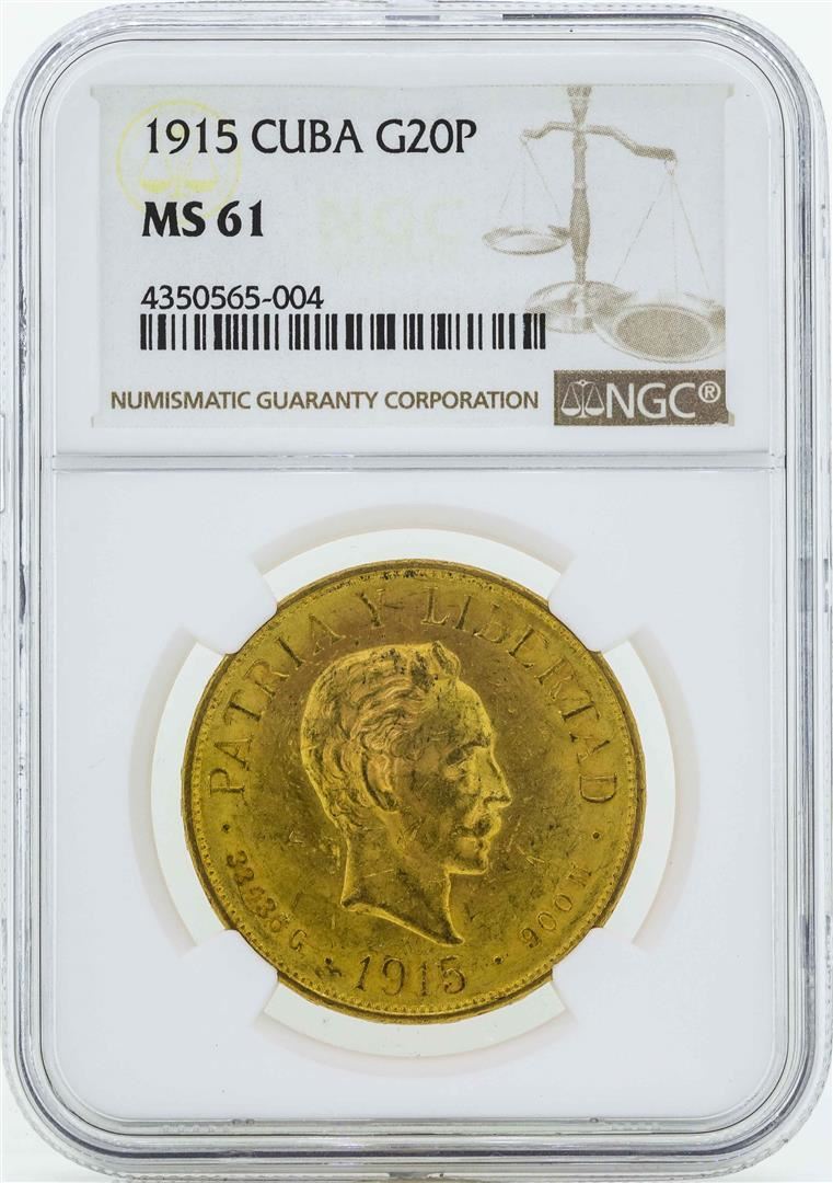 One 1915 Cuba 20 Pesos Gold Coin NGC MS61. NGC Certified.