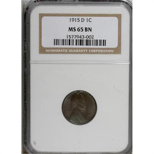<B>1915-D 1C MS65 Brown NGC.</B></I> NGC Census: (39/1). PCGS Population (9/0). Mintage: 22,050,000. Numismedia Wsl. Price for NGC/PCGS coin in MS65: $175. (#2480)<BR><BR><B>Coin Engraver:</B> Victor D. Brenner<BR><BR><b>Shipping:</b> Coins & Currency (<a target="_blank" href="http://www.heritageauctions.com/common/shipping.php">view shipping information</a>)