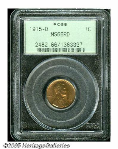 <B>1915-D<1C> MS66 Red PCGS.</B></I> Only slightly scarce in lower grades, average Mint State examples are noticeably more challenging to locate. Only in Gem, fully red condition is the '15-D truly scarce. This is a strict, premium Gem example with pinpoint detailing in Lincoln's portrait and variegated pink-red and orange patina over each side. Close examination reveals a tiny toning spot adjacent to the middle crossbar of the E in ONE. Certainly one of the finest known examples of this date. Population: 17 in 66, none finer (6/05).
