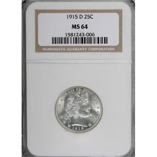 <B>1915-D 25C MS64 NGC.</B></I> Just a hint of sky-blue and gold visits the otherwise silver-white surfaces of this late-date Barber quarter. Choice and well-defined for the issue with minor, scattered marks that preclude a finer grade.<BR><BR><B>Coin Engraver:</B> Charles E. Barber<BR><BR><b>Shipping:</b> Coins & Currency (<a target="_blank" href="http://www.heritageauctions.com/common/shipping.php">view shipping information</a>)