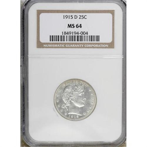 <B>1915-D 25C MS64 NGC.</B></I> NGC Census: (142/71). PCGS Population (181/148). Mintage: 3,694,000. Numismedia Wsl. Price for NGC/PCGS coin in MS64: $472. (#5671)<BR><BR><B>Coin Engraver:</B> Charles E. Barber<BR><BR><b>Shipping:</b> Coins & Currency (<a target="_blank" href="http://www.heritageauctions.com/common/shipping.php">view shipping information</a>)