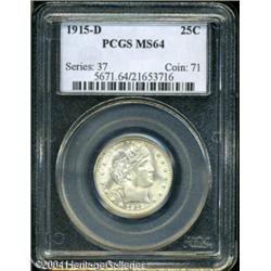 1915-D 25C MS64 PCGS. Light apricot patina and vib <B>1915-D 25C MS64 PCGS.</B></I> Light apricot patina and vibrant cartwheel luster affirms the quality of this crisply struck final year Barber Half. The reverse is virtually pristine, although a few minor ticks on the portrait deny classification as a Gem. <BR><BR><B>Important notice:</B> Heritage usually auctions material at the rate of 200-250 lots per hour. On some occasions eBay Live bid software or the Internet may not be able to keep up with the pace of the auction. We recommend placing a realistic absentee bid now as insurance to avoid disappointment. Occasionally the auctioneer may eliminate or reject an eBay Live bid, and the auctioneer may also reopen a lot after the close of the eBay live bidding (usually because we missed an audience bid), and may reject your bid even if it shows you as the winning bidder. By bidding via eBay Live, you agree that Heritage may award the lot to another bidder at its sole discretion under the circumstances described above or any other reasonable circumstances. Since eBay bids are not shown to us until we open the lot on the floor, we treat those bids just like floor bids. In most cases the floor responds before the eBay bid is presented to us, due to Internet lag time, so for consistency we have made it a policy that floor bids are always considered first over tie eBay live bids. Also please note that all Heritage lots purchased through eBay Live carry a 20% Buyer's Premium. Please make sure you read the Terms and Conditions before you bid. This lot is being auctioned in conjunction with a live floor auction by Heritage Galleries & Auctioneers. All final auction and invoice information will be supplied by Heritage Galleries & Auctioneers, and all other information should be considered preliminary. Lot:5916