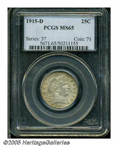 <B>1915-D<25C> MS65 PCGS.</B></I> Fully lustrous and sharply struck with frosty silver surfaces and excellent eye appeal. This Gem quality Barber Quarter has flecks of deep gold toning over dark champagne surfaces.