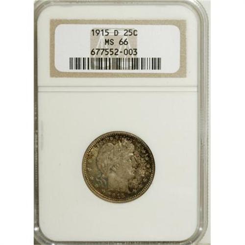 <B>1915-D 25C MS66 NGC.</B></I> Ice-blue, emerald-green, russet, and a few dashes of scarlet surround the margins with lighter colored centers. Only a few minute marks are detected on the portrait. Fully struck and attractively preserved with uncommon eye appeal. Census: 10 in 66, 4 finer (5/07).<BR><BR><b>Shipping:</b> Coins & Currency (<a target="_blank" href="http://www.heritageauctions.com/common/shipping.php">view shipping information</a>)
