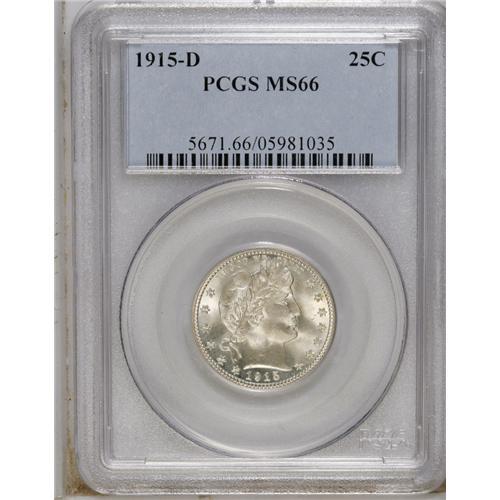<B>1915-D 25C MS66 PCGS.</B></I> Highly lustrous and slightly hazy with thin streaks of olive patina in the right obverse field. Slight striking weakness is noted at the eagle's sinister claw. Population: 19 in 66, 2 finer (12/06).<BR><BR><b>Shipping:</b> Coins & Currency (<a target="_blank" href="http://www.heritageauctions.com/common/shipping.php">view shipping information</a>)