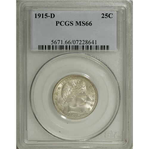 <B>1915-D 25C MS66 PCGS.</B></I> This is an exceptionally attractive type coin. Both sides are satiny with a light coating of silver-gray patina and a few speckles of russet near the border. Well struck, save for the often-weak eagle's right talon, and unusually clean with a great amount of eye appeal.<BR><BR><b>Shipping:</b> Coins & Currency (<a target="_blank" href="http://www.heritageauctions.com/common/shipping.php">view shipping information</a>)