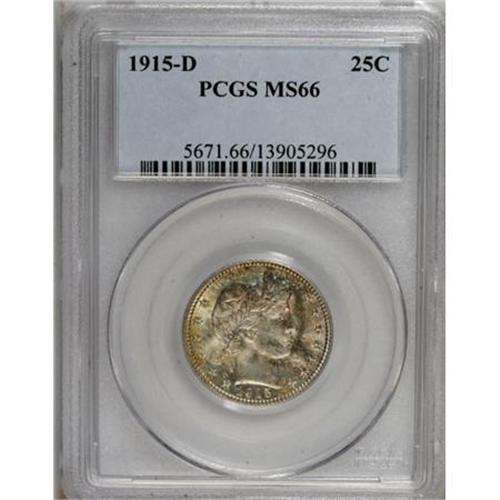 <B>1915-D 25C MS66 PCGS.</B></I> An incredibly well-preserved survivor from this little-saved issue, well struck with dappled sky-blue and gold-green patina over the silver surfaces. PCGS has graded only two coins finer (9/07).<BR><BR><B>Coin Engraver:</B> Charles E. Barber<BR><BR><b>Shipping:</b> Coins & Currency (<a target="_blank" href="http://www.heritageauctions.com/common/shipping.php">view shipping information</a>)