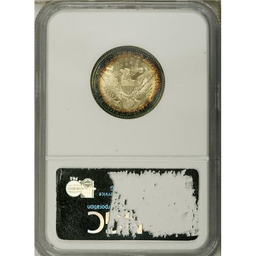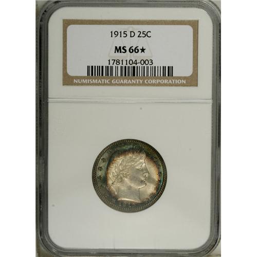 <B>1915-D 25C MS66 <img border='0' src='http://www.heritagecoins.com/images/star.gif' width=10 height=10> NGC.</B></I> Quite frosty with elliptical areas of brilliance framed in rich turquoise and russet toning. Nicely detailed except for a couple of the obverse stars and the eagle's talons. An extraordinary Barber type coin. Population: 2 in 66 S, none finer with a Star designation (11/06).<BR><I>From The Hill Country Collection.</B></I><BR><BR><b>Shipping:</b> Coin/Currency (<a target="_blank" href="http://www.heritageauctions.com/common/shipping.php">view shipping information</a>)