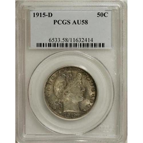 <B>1915-D 50C AU58 PCGS.</B></I> PCGS Population (67/343). NGC Census: (54/317). Mintage: 1,170,400. Numismedia Wsl. Price for NGC/PCGS coin in AU58: $275. (#6533)<BR><BR><B>Coin Engraver:</B> Charles E. Barber<BR><BR><b>Shipping:</b> Coins & Currency (<a target="_blank" href="http://www.heritageauctions.com/common/shipping.php">view shipping information</a>\)