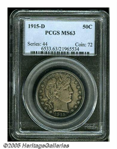<B>1915-D<50C> MS63 PCGS.</B></I> Lustrous surfaces are overlain by speckles of charcoal-gray patina in the central areas, and transition to a layer of the patina around the peripheries. Nice definition is apparent on the design elements. Some small marks on Liberty's cheek and neck preclude a higher grade.