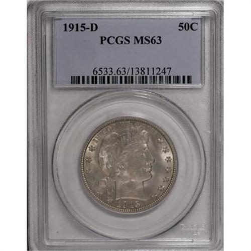 <B>1915-D 50C MS63 PCGS.</B></I> Subtle variations appear in the silver-gray patina of this Select final-year D-mint Barber half. Well-defined on the portrait, though the eagle shows significant softness.<BR><BR><B>Coin Engraver:</B> Charles E. Barber<BR><BR><b>Shipping:</b> Coins & Currency (<a target="_blank" href="http://www.heritageauctions.com/common/shipping.php">view shipping information</a>)