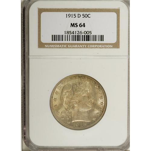 <B>1915-D 50C MS64 NGC.</B></I> Autumn-gold toning is slightly deeper on the obverse, while the reverse displays brighter yellow-gold tints. A well preserved and lustrous near-Gem only limited in grade by minor incompleteness of strike near the right shield corner.<BR><BR><b>Shipping:</b> Coins & Currency (<a target="_blank" href="http://www.heritageauctions.com/common/shipping.php">view shipping information</a>)