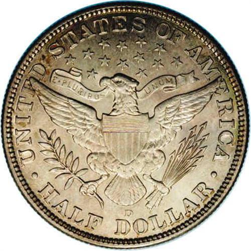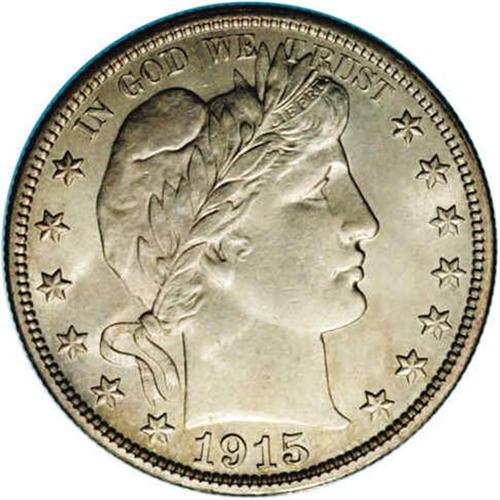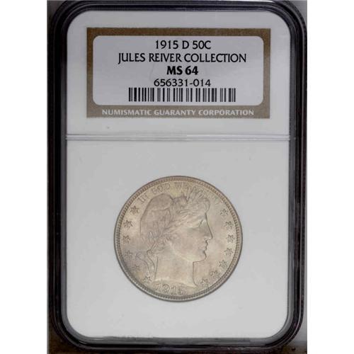 <B>1915-D<50C> MS64 NGC.</B></I> Lustrous and attractive. Vivid orange-gold iridescence with blushes of navy blue and violet. The strike is good with most features showing bold definition including each of the obverse stars. A touch of softness is noted at the tresses of hair above Liberty's forehead and at a few of the eagle's feather details. Two fine die cracks are noted on the obverse.