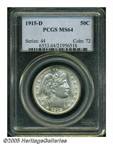<B>1915-D<50C> MS64 PCGS.</B></I> A lightly toned and lustrous representative, crisply struck and nearly unmarked. The most available issue in the Barber Half series, but still quite scarce in Mint State when compared with other 20th century series.
