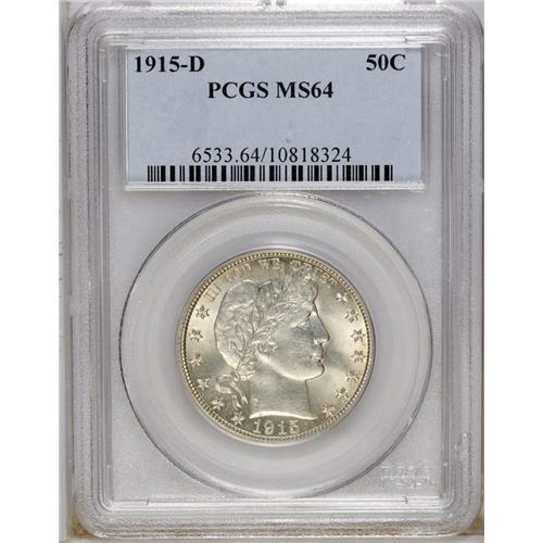 <B>1915-D 50C MS64 PCGS.</B></I> Highly lustrous with a trace of yellow in the fields. The strike is solid, and this piece would be a Gem if not for two abrasions at the lower neck of Liberty.<BR><BR><b>Shipping:</b> Coin/Currency (<a target="_blank" href="http://www.heritageauctions.com/common/shipping.php">view shipping information</a>)