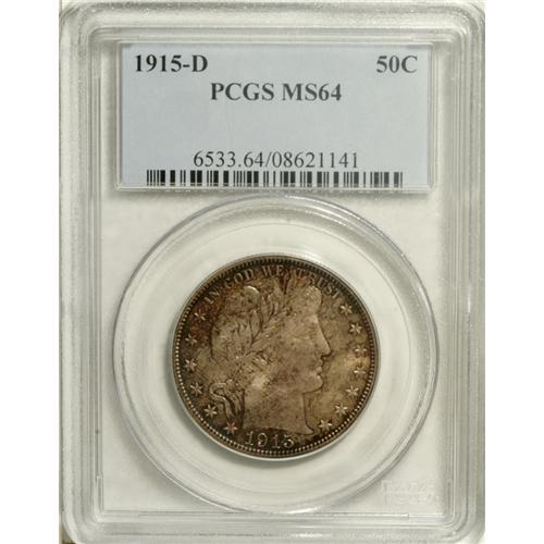 <B>1915-D 50C MS64 PCGS.</B></I> Magnificent rose-red, lime-green, and orange shades grace the reverse, while the obverse is predominantly pearl-gray. This undulating near-Gem has a good strike and a well preserved reverse.<BR><BR><b>Shipping:</b> Coins & Currency (<a target="_blank" href="http://www.heritageauctions.com/common/shipping.php">view shipping information</a>)