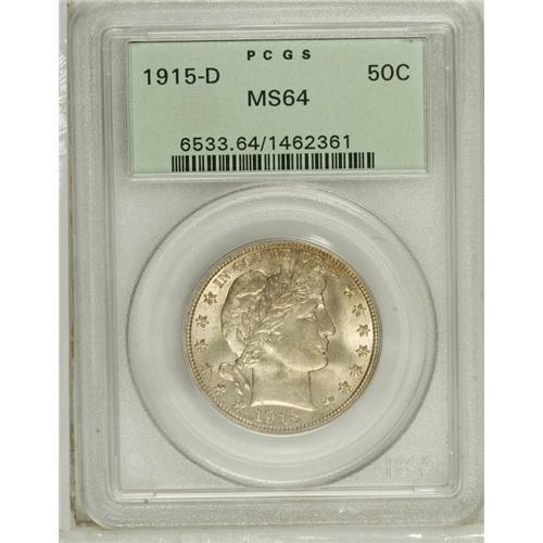 <B>1915-D 50C MS64 PCGS.</B></I> Nicely struck with delightful and original luster. The reverse is largely untoned, though the obverse has areas of light russet and gold patina.<BR><BR><b>Shipping:</b> Coin/Currency (<a target="_blank" href="http://www.heritageauctions.com/common/shipping.php">view shipping information</a>)