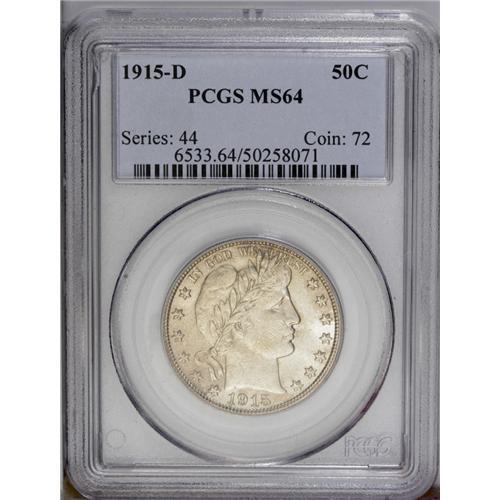 <B>1915-D<50C> MS64 PCGS.</B></I> Thick, satiny mint luster and lightly toned with a sharp (but not quite complete) strike. Marred only by a couple of short, diagonal marks on the cheek of Liberty. <BR><BR><B>Important notice:</B> Heritage usually auctions material at the rate of 200-250 lots per hour. On some occasions eBay Live bid software or the Internet may not be able to keep up with the pace of the auction. We recommend placing a realistic absentee bid now as insurance to avoid disappointment. Occasionally the auctioneer may eliminate or reject an eBay Live bid, and the auctioneer may also reopen a lot after the close of the eBay live bidding (usually because we missed an audience bid), and may reject your bid even if it shows you as the winning bidder. By bidding via eBay Live, you agree that Heritage may award the lot to another bidder at its sole discretion under the circumstances described above or any other reasonable circumstances. Since eBay bids are not shown to us until we open the lot on the floor, we treat those bids just like floor bids. In most cases the floor responds before the eBay bid is presented to us, due to Internet lag time, so for consistency we have made it a policy that floor bids are always considered first over tie eBay live bids. Also please note that all Heritage lots purchased through eBay Live carry a 20% Buyer's Premium. Please make sure you read the Terms and Conditions before you bid. This lot is being auctioned in conjunction with a live floor auction by Heritage Galleries & Auctioneers. All final auction and invoice information will be supplied by Heritage Galleries & Auctioneers, and all other information should be considered preliminary. Lot:2081 <BR><BR><B>Winning Notification and Billing:</B> After the FINAL session in this auction is complete, Heritage will send e-mail and snail mail invoices. This process normally takes several days. All final auction and invoice information will be supplied by Heritage Galleries & Auctioneers, and all other information should be considered preliminary. <BR><BR>This auction will be conducted on a live auction floor and over the Internet through eBay Live. If you choose to place an absentee bid, please take a moment to <font color='#0000ff'><u><a href='http://pages.ebay.com/liveauctions/help/before/laabsentee.html'>learn how eBay Live absentee bidding works</a></u></font><font color='#000000'>