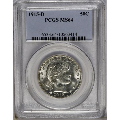 <B>1915-D<50C> MS64 PCGS.</B></I> This brilliant near-Gem has booming luster and gorgeously smooth fields. Even the portrait has inconsequential contact. A good strike despite minor incompleteness of strike on the right shield corner and fletchings.