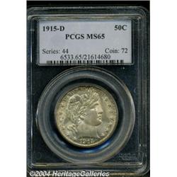 <B>1915-D<50C> MS65 PCGS.</B></I> Quite frosty with a delicate, speckled overlay of yellow-gold toning that lightens somewhat in the centers. A splendid D-Mint Half Dollar that should really be considered for the carefully assembled Gem type set. Population: 29 in 65, 10 finer (7/04). <BR><BR><B>Important notice:</B> Heritage usually auctions material at the rate of 200-250 lots per hour. On some occasions eBay Live bid software or the Internet may not be able to keep up with the pace of the auction. We recommend placing a realistic absentee bid now as insurance to avoid disappointment. Occasionally the auctioneer may eliminate or reject an eBay Live bid, and the auctioneer may also reopen a lot after the close of the eBay live bidding (usually because we missed an audience bid), and may reject your bid even if it shows you as the winning bidder. By bidding via eBay Live, you agree that Heritage may award the lot to another bidder at its sole discretion under the circumstances described above or any other reasonable circumstances. Since eBay bids are not shown to us until we open the lot on the floor, we treat those bids just like floor bids. In most cases the floor responds before the eBay bid is presented to us, due to Internet lag time, so for consistency we have made it a policy that floor bids are always considered first over tie eBay live bids. Also please note that all Heritage lots purchased through eBay Live carry a 20% Buyer's Premium. Please make sure you read the Terms and Conditions before you bid. </span></font></tr></table></td></tr></table>