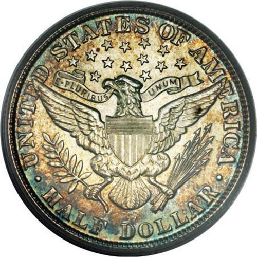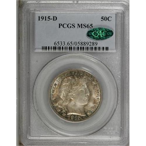 <B>1915-D 50C MS65 PCGS.</B></I> CAC. A colorful treat from the last year of Barber half dollar production, this piece boasts predominantly golden toning in the midst of russet and sea blue peripheries. The high degree of luster only adds to the impressive visual effect. A few grade-limiting marks can be seen on the obverse.<BR><BR><B>Coin Engraver:</B> Charles E. Barber<BR><BR><b>Shipping:</b> Coins & Currency (<a target="_blank" href="http://www.heritageauctions.com/common/shipping.php">view shipping information</a>)