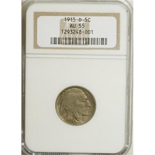 <B>1915-D 5C AU55 NGC.</B></I> NGC Census: (18/596). PCGS Population (47/733). Mintage: 7,569,000. Numismedia Wsl. Price for NGC/PCGS coin in AU55: $121. (#3928)<BR><BR><b>Shipping:</b> Coins & Currency (<a target="_blank" href="http://www.heritageauctions.com/common/shipping.php">view shipping information</a>)