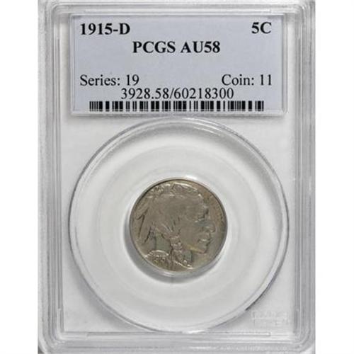 <B>1915-D 5C AU58 PCGS.</B></I> PCGS Population (117/651). NGC Census: (118/493). Mintage: 7,569,000. Numismedia Wsl. Price for NGC/PCGS coin in AU58: $150. (#3928)<BR><BR><B>Coin Engraver:</B> James E. Fraser<BR><BR><b>Shipping:</b> Coins & Currency (<a target="_blank" href="http://www.heritageauctions.com/common/shipping.php">view shipping information</a>)