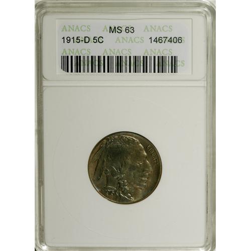 <B>1915-D 5C MS63 ANACS.</B></I> NGC Census: (112/218). PCGS Population (206/336). Mintage: 7,569,000. Numismedia Wsl. Price: $304. (#3928)<BR><BR><b>Shipping:</b> Coins & Currency (<a target="_blank" href="http://www.heritageauctions.com/common/shipping.php">view shipping information</a>)