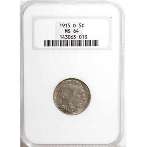 <B>1915-D 5C MS64 NGC.</B></I> NGC Census: (168/55). PCGS Population (199/140). Mintage: 7,569,000. Numismedia Wsl. Price for NGC/PCGS coin in MS64: $480. (#3928)<BR><BR><B>Coin Engraver:</B> James E. Fraser<BR><BR><b>Shipping:</b> Coins & Currency (<a target="_blank" href="http://www.heritageauctions.com/common/shipping.php">view shipping information</a>)