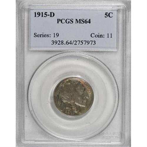 <B>1915-D 5C MS64 PCGS.</B></I> PCGS Population (195/140). NGC Census: (167/55). Mintage: 7,569,000. Numismedia Wsl. Price for NGC/PCGS coin in MS64: $480. (#3928)<BR><BR><B>Coin Engraver:</B> James E. Fraser<BR><BR><b>Shipping:</b> Coins & Currency (<a target="_blank" href="http://www.heritageauctions.com/common/shipping.php">view shipping information</a>)
