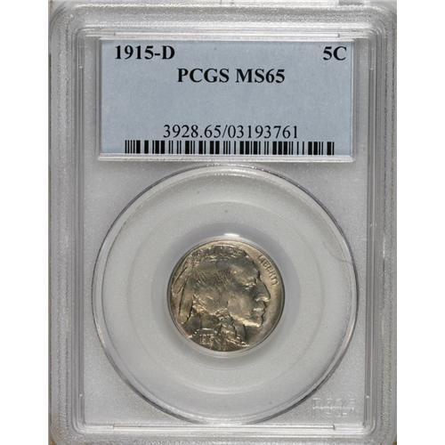 <B>1915-D 5C MS65 PCGS.</B></I> This lustrous almond-gold and pearl-gray Gem has an uncommonly sharp strike, since the tail, the mintmark, and date are needle-sharp. The bison's shoulder is slightly rough, as made, but the surfaces are virtually void of marks.<BR><BR><b>Shipping:</b> Coins & Currency (<a target="_blank" href="http://www.heritageauctions.com/common/shipping.php">view shipping information</a>)