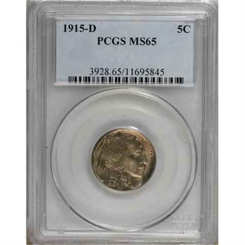 <B>1915-D 5C MS65 PCGS.</B></I> Slightly soft over the centers and on the bison's head, but otherwise boldly struck. The olive-gray surfaces reveal a few russet specks upon close examination. A lustrous, well preserved Gem. Conditionally scarce at MS65, and rare any finer. <BR><BR><b>Shipping:</b> Coins & Currency (<a target="_blank" href="http://www.heritageauctions.com/common/shipping.php">view shipping information</a>)