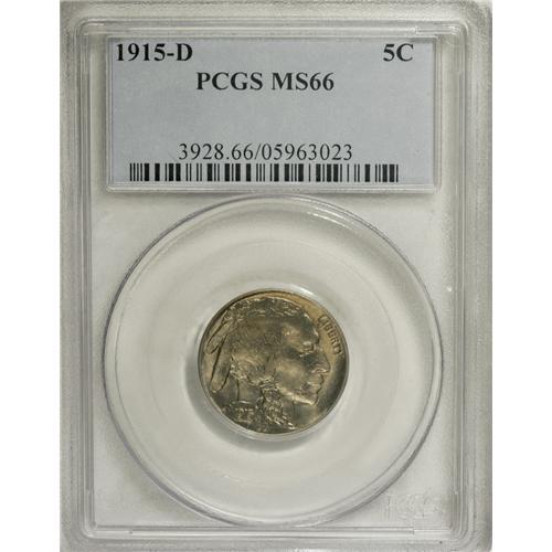 <B>1915-D 5C MS66 PCGS.</B></I> David Lange (2005) writes that the 1915-D nickel "... is the first date from the Denver Mint in which weakness of strike becomes a factor." The Premium Gem in this lot certainly is better defined than most, revealing as it does relatively sharp detail on the bison's head and tail, areas where the weak strike becomes evident. A thin veneer of champagne-gold rests upon lustrous surfaces that are devoid of significant marks. Population: 24 in 66, 2 finer (3/07).<BR><BR><b>Shipping:</b> Coins & Currency (<a target="_blank" href="http://www.heritageauctions.com/common/shipping.php">view shipping information</a>)