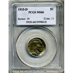 <B>1915-D<5C> MS66 PCGS.</B></I> Each side of this deeply lustrous Gem displays dominant antique-golden patina that has overlaid the surfaces in a smooth, even fashion. Hints of pink are seen at the centers as the coin is turned under a light. Although the 1915-D as an issue is the first poorly struck Buffalo Nickel from the Denver Mint (per Lange, 2000), the present example is well detailed in all areas. Population: 17 in 66, just 2 are finer (7/04). <BR><BR><B>Important notice:</B> Heritage usually auctions material at the rate of 200-250 lots per hour. On some occasions eBay Live bid software or the Internet may not be able to keep up with the pace of the auction. We recommend placing a realistic absentee bid now as insurance to avoid disappointment. Occasionally the auctioneer may eliminate or reject an eBay Live bid, and the auctioneer may also reopen a lot after the close of the eBay live bidding (usually because we missed an audience bid), and may reject your bid even if it shows you as the winning bidder. By bidding via eBay Live, you agree that Heritage may award the lot to another bidder at its sole discretion under the circumstances described above or any other reasonable circumstances. Since eBay bids are not shown to us until we open the lot on the floor, we treat those bids just like floor bids. In most cases the floor responds before the eBay bid is presented to us, due to Internet lag time, so for consistency we have made it a policy that floor bids are always considered first over tie eBay live bids. Also please note that all Heritage lots purchased through eBay Live carry a 20% Buyer's Premium. Please make sure you read the Terms and Conditions before you bid. </span></font></tr></table></td></tr></table>
