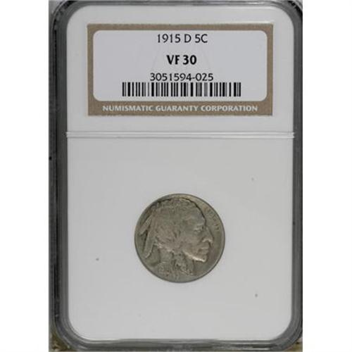 <B>1915-D 5C VF30 NGC.</B></I> NGC Census: (5/655). PCGS Population (6/877). Mintage: 7,569,000. Numismedia Wsl. Price for NGC/PCGS coin in VF30: $68. (#3928)<BR><BR><B>Coin Engraver:</B> James E. Fraser<BR><BR><b>Shipping:</b> Coins & Currency (<a target="_blank" href="http://www.heritageauctions.com/common/shipping.php">view shipping information</a>)