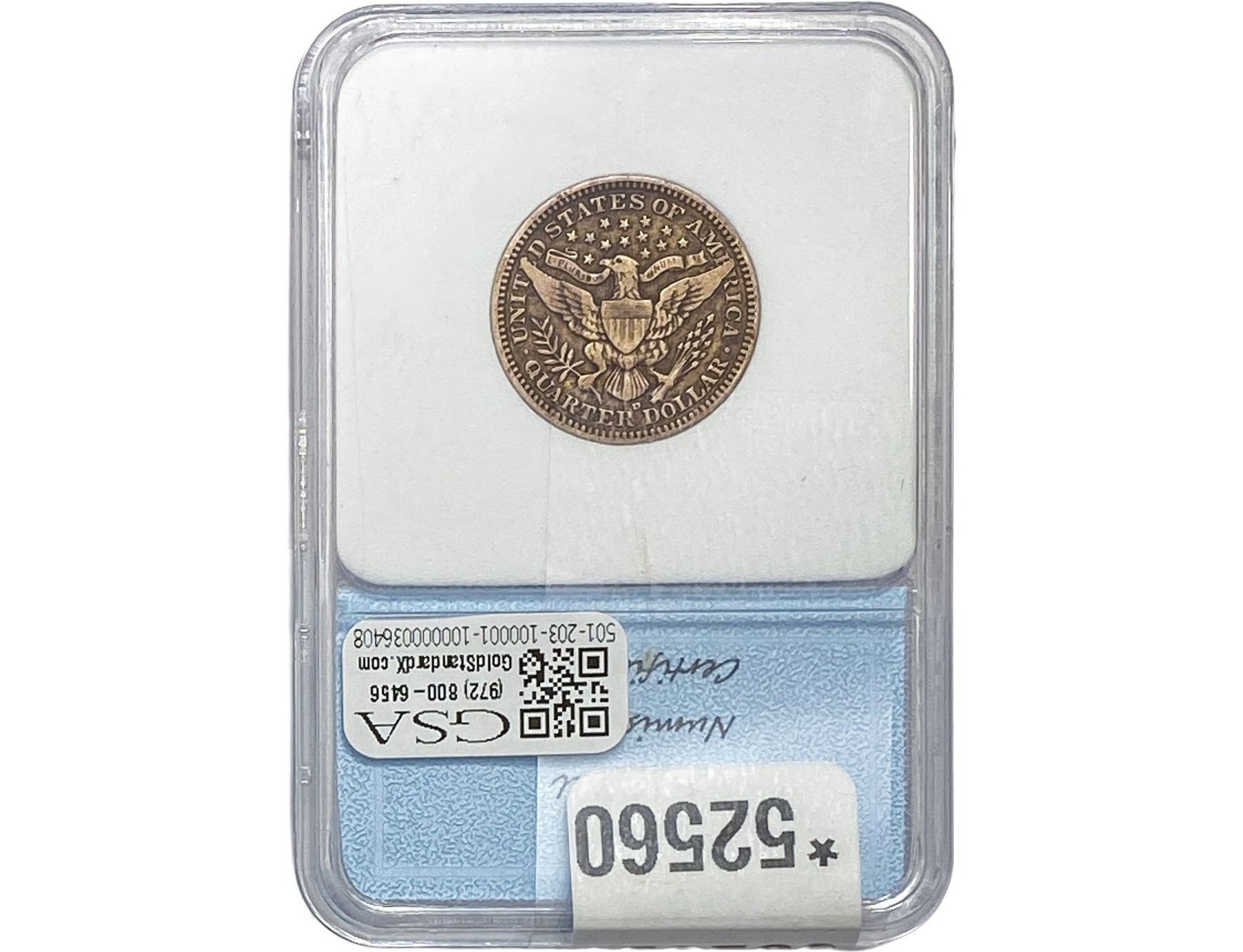 l. All non-certified coins and currency are guaranteed genuine, but are not guaranteed as to grade, since grading is a matter of opinion, an art and not a science, and therefore the description rendered by GSA or any third-party grading service may not agree with the opinion of others (including trained experts), and the same expert may not grade the same item with the same grade at two different times. GSA may, but is not obligated to, express an opinion as to non-certified numismatic items, in GSA’s opinion, or by its employees’ experience and the current interpretation of the American Numismatic Association’s standards as of the date the catalog was prepared. There is no guarantee or warranty expressed or implied that the grading opinions utilized by GSA, if any, will meet the standards of any grading service at any time in the future.