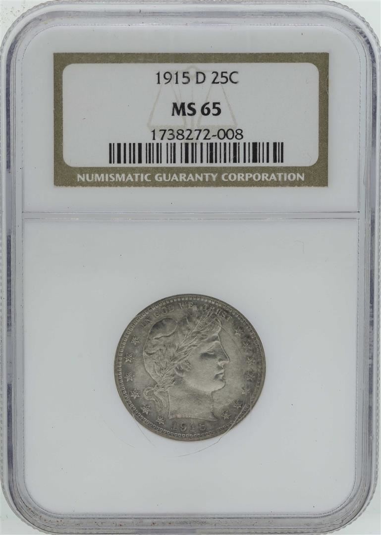 One 1915-D Barber Quarter Silver Coin NGC MS65. NGC Certified.