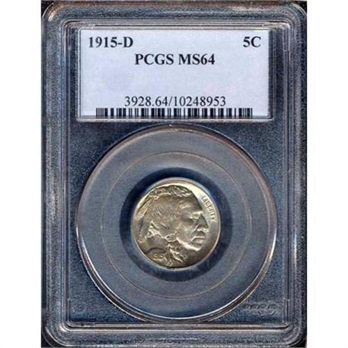 <b>1915-D Buffalo Nickel. PCGS graded MS64.</b> A satiny 1915-D of the first order for its middle grade. A high degree of bright cartwheel luster spins broadly on top of the shimmering highlights. Nicely struck with just a modicum of weakness above the Indian's hair braid <b>(PCGS # 3928)</b> <i>