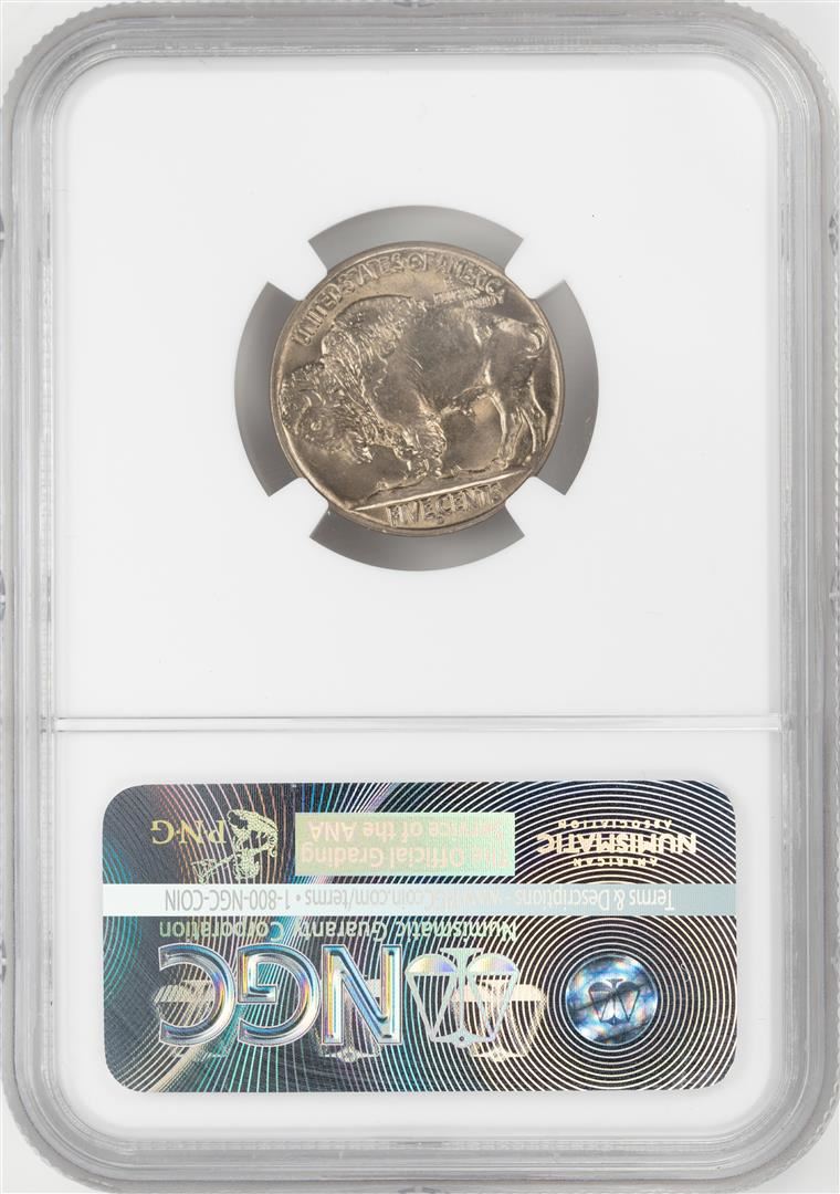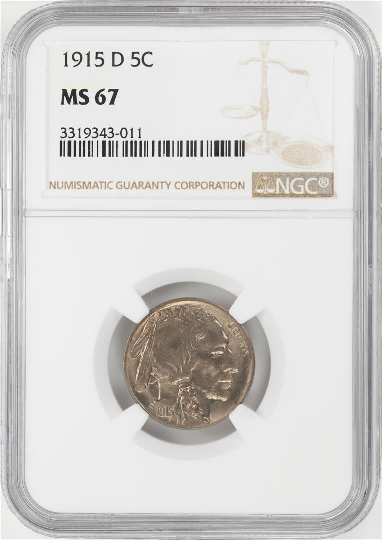 One 1915-D Buffalo Nickel Coin NGC MS67. The 1915-D Buffalo nickel, issued in the amount of 7.6 million pieces, is often a strike-challenged issue, although the viewer would never know it by laying eyes upon this remarkable coin. David Lange writes in his series reference: "This is the first date from the Denver Mint in which weakness of strike becomes a factor. Though not extreme, it may be evident in the central obverse and the bison's head, shoulders and tail. Well struck examples do exist and are worth the wait." This piece shows a strong strike, the central braid area, the feathers, the horn and fur on the bison, and split tail indicate a strike that is far above the norm. Full luster prevails throughout the gray-gold surfaces. NGC Certified.