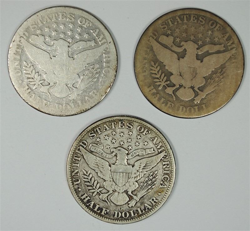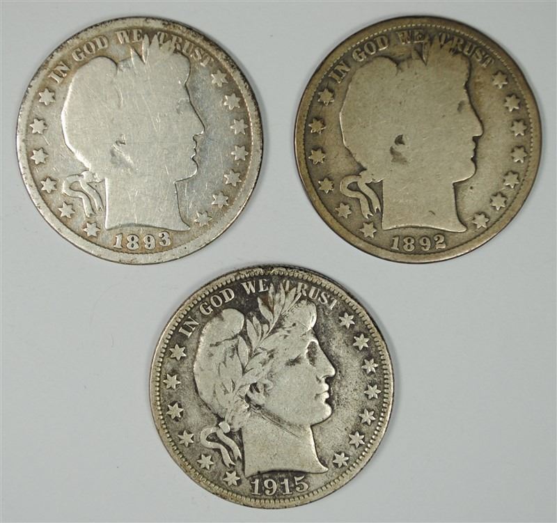 1915-D FINE, 1892, 1893 G BARBER HALF DOLLARS