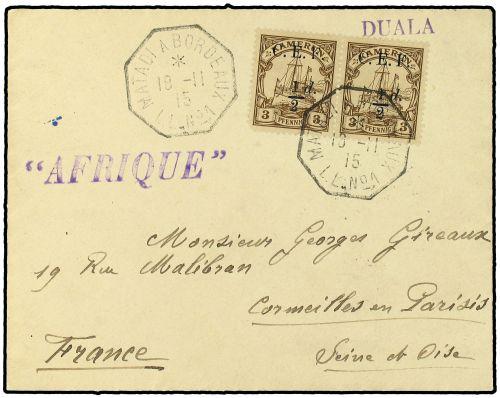 1915 Envelope to FRANCE bearing C.E.F. 1/2 d on 3 pf brown (pair) (SG 1) tied by octagonal French paquebot MATADI A BORDEAUX L.L. No 1 datestamp (Salles 1228) with hand-struck DUALA in violet sent on the steamer AFRIQUE with hand-stamp cachet in violet and CORMEILLES arrival in France on reverse. Very fine and scarce.