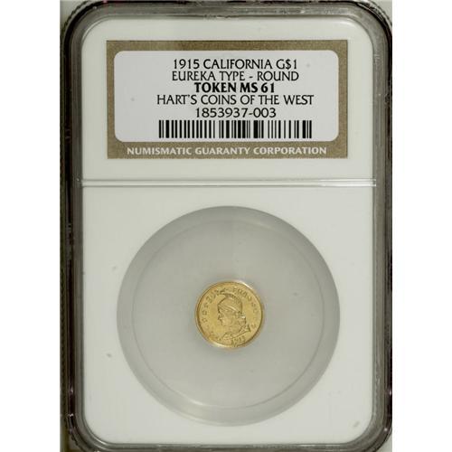 <B>1915 Eureka Gold Token MS61 NGC.</B></I> Gold dollar size. An entry in Hart's Coins of the Golden West series, which were ultimately distributed by Farran Zerbe at the Panama-Pacific Exposition. M.E. Hart created a variety of small gold tokens or charms bearing various dates and representing various regions. All of those pieces are quite rare today.<BR><BR><b>Shipping:</b> Coins & Currency (<a target="_blank" href="http://www.heritageauctions.com/common/shipping.php">view shipping information</a>)