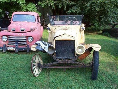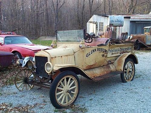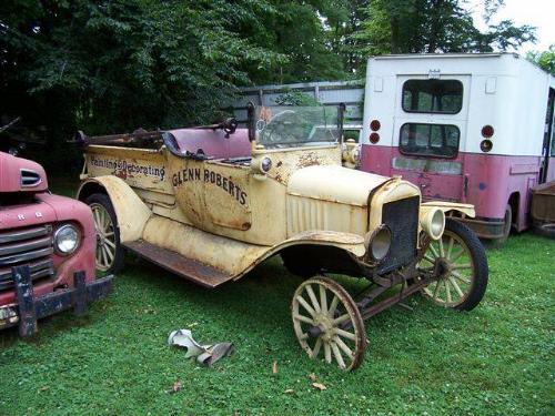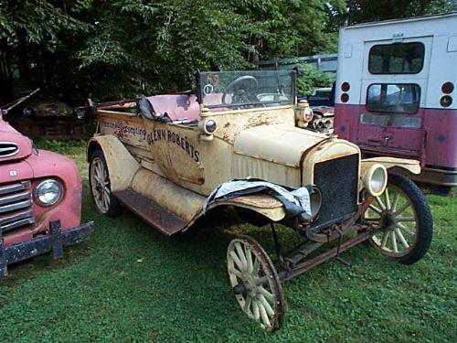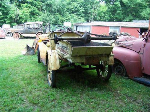 COMPLETE TRUCK, YELLOW WITH OLD ADVERTISING ON SIDE. WOOD WOOD SPOKE WHEELS, LEATHER SEAT NEEDS REPLACEMENT, DOES HAVE RUST, BEEN STORED IN BARN. COOL PROJECT