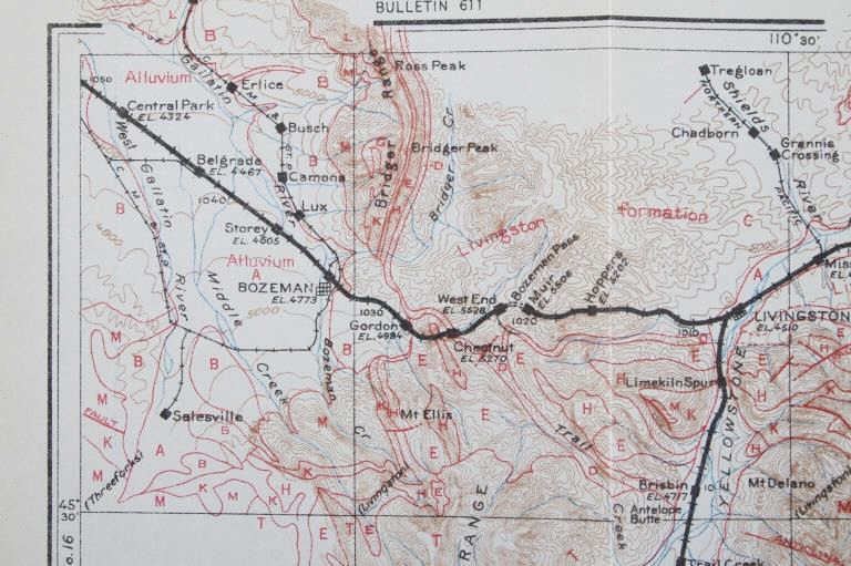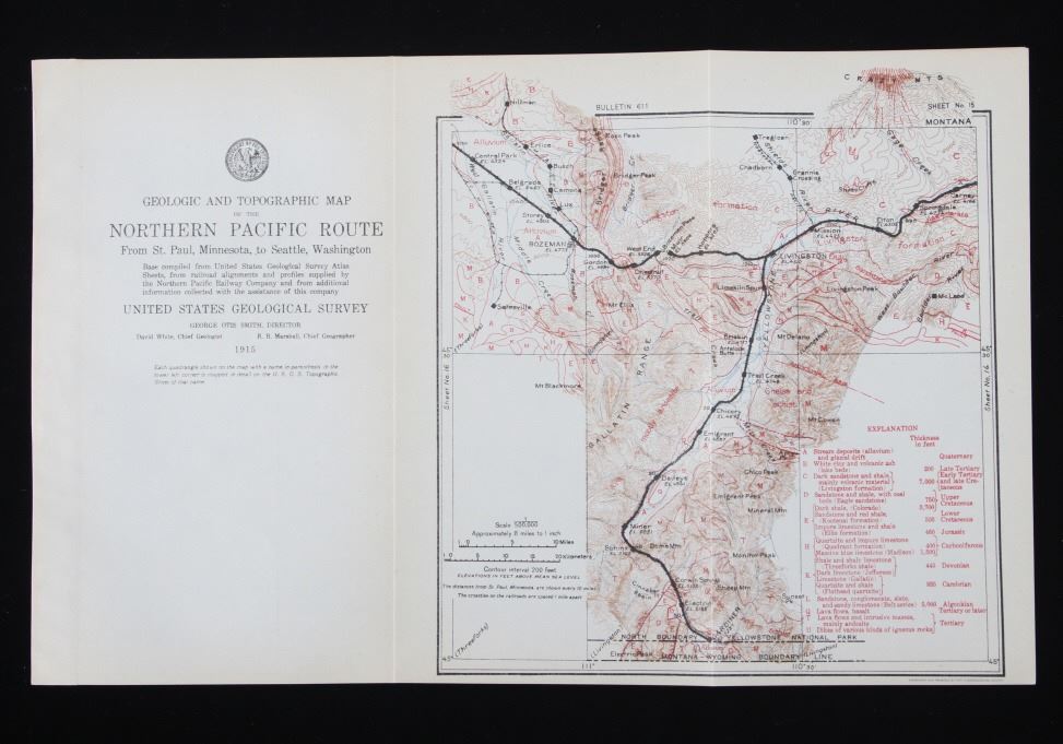 Featured in this lot is this 1915 Geological and Topographic Map of the Northern Pacific Route from St. Paul, Minnesota to Seattle, Washington. This is a United States Geological Survey map. The condition of this map is good, with no obvious signs of damage except for browning to the paper consistent with the age of the map; the map is shown inside a plastic protective sleeve. The measurements of the map are