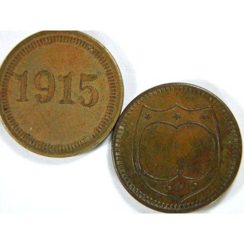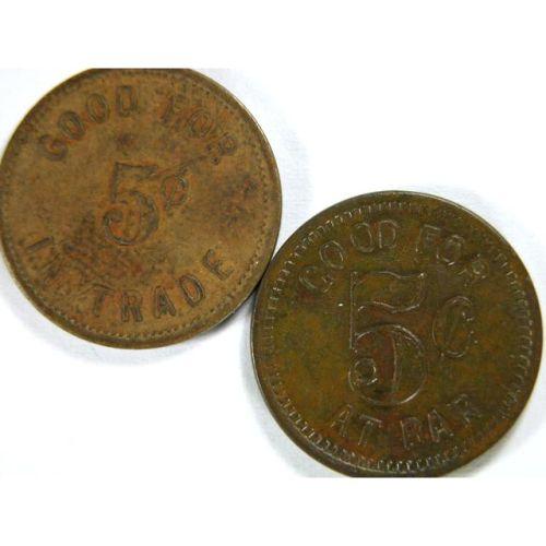 1915 Good for 5¢ in Trade and Good for 5¢ at Bar. Two pieces, both EF